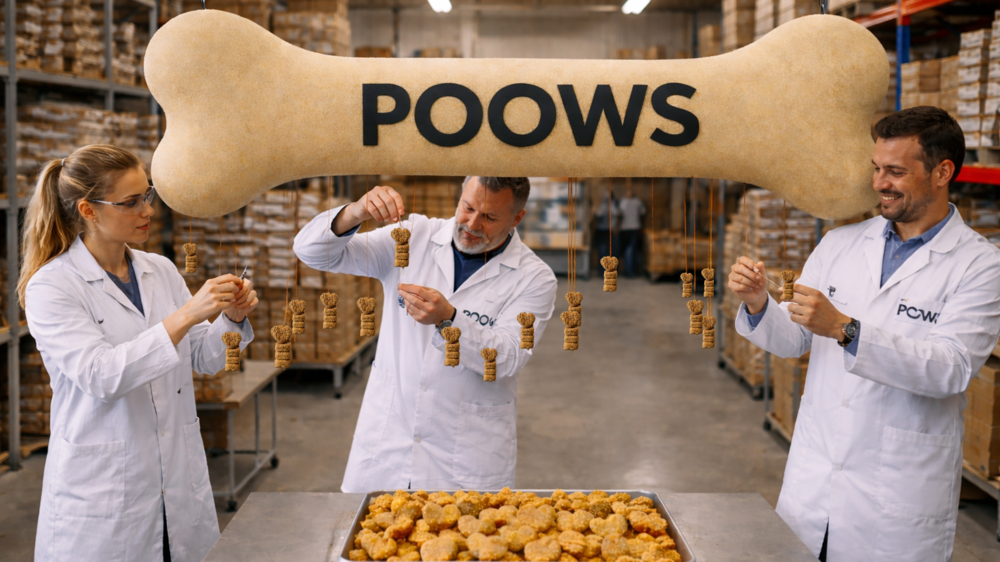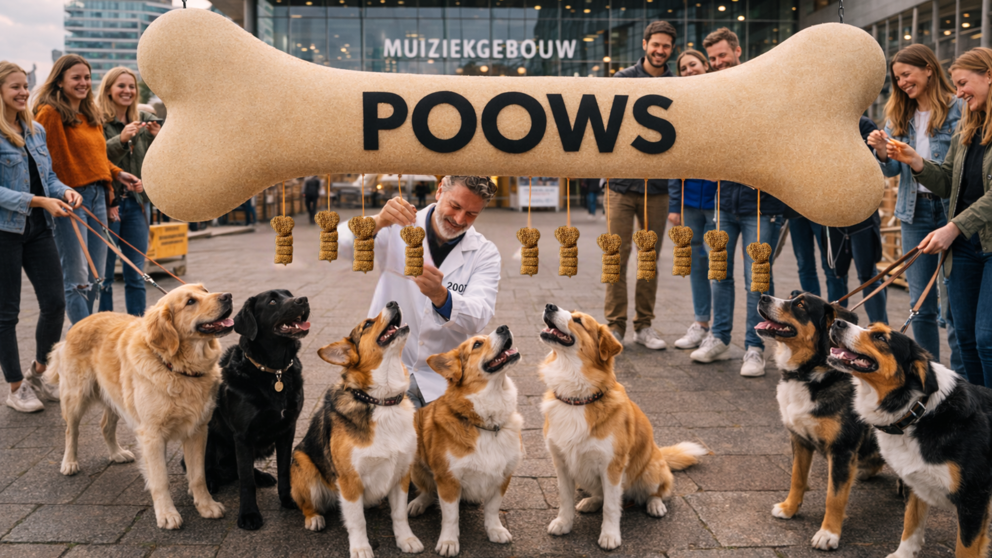 Outside Amsterdam’s Muziekgebouw, where a major food festival took place, POOWS built a monumental dog-feeding installation: a giant bone suspended above the pavement, loaded with real POOWS heart-shaped snacks. Dogs gathered. Owners stopped. Soon, dozens of dogs were eating together while their owners laughed, filmed, and shared the moment. To underline the care behind the idea, we showed how the installation was built: the bone was prepared in POOWS’ own facility, using real POOWS snacks like the ones dogs eat every day at home.